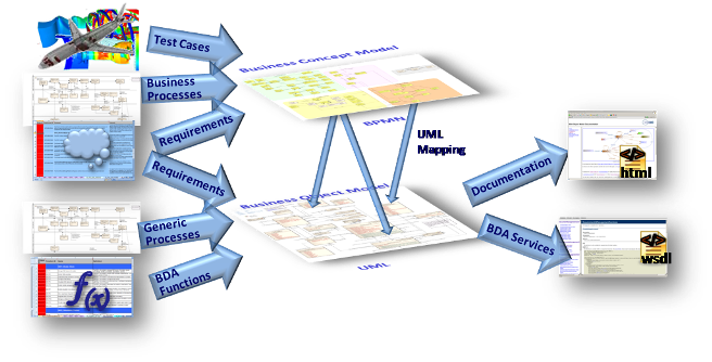 From a Business Object Model perspective, the Business Concept Model serves as the requirements for the information and semantics that need to be represented by a set of information entities and their behaviour. Other inputs are the requirements, generic processes, and also the BDA Capability functions and services (which are part of the Functional Layer of the Architecture framework).