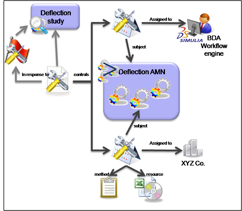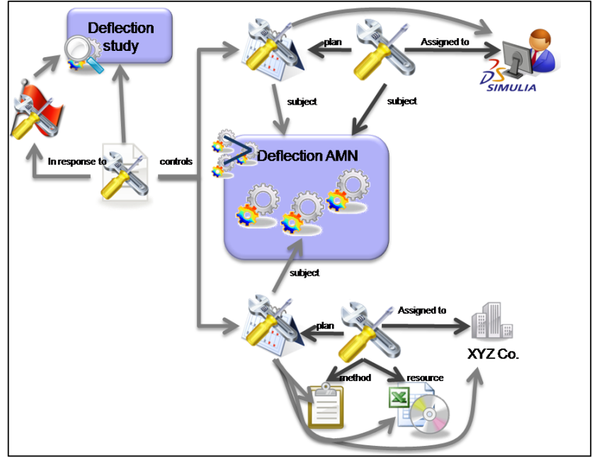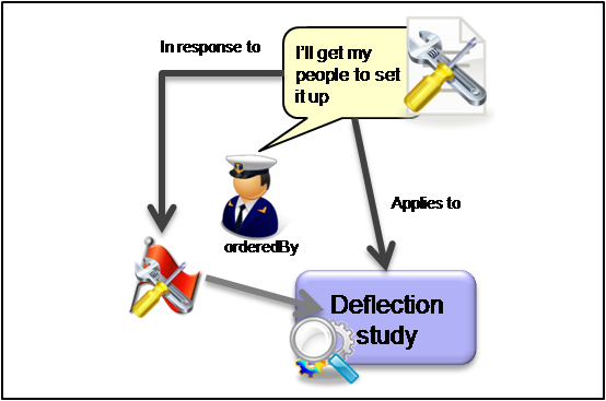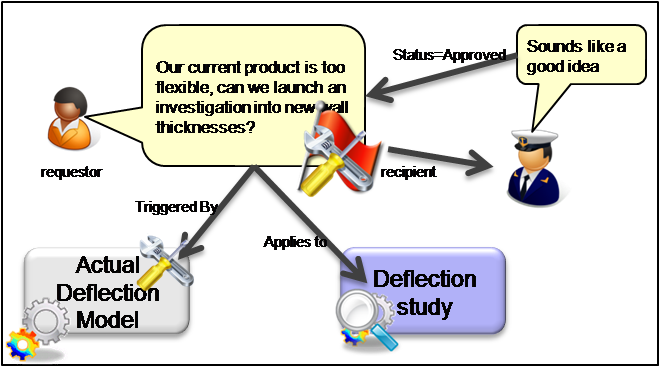 Some work has been done that has identified a problem with excessive deflection. Someone then requests that a new study is launched to try and resolve the issue by investigating an alternative wall thickness. So the Request is triggered by the earlier deflection calculation activity, it applies to the new deflection study, is requested by someone (requestor), and is sent to someone (recipient).