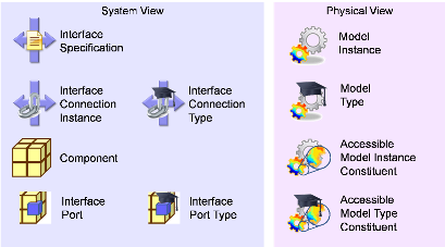The icons representing Interfaces and Components, with the icons for the models are shown below. Interfaces are blue, with the connection represented as a bar with arrows pointing away. The ports are blue blocks on the yellow component.