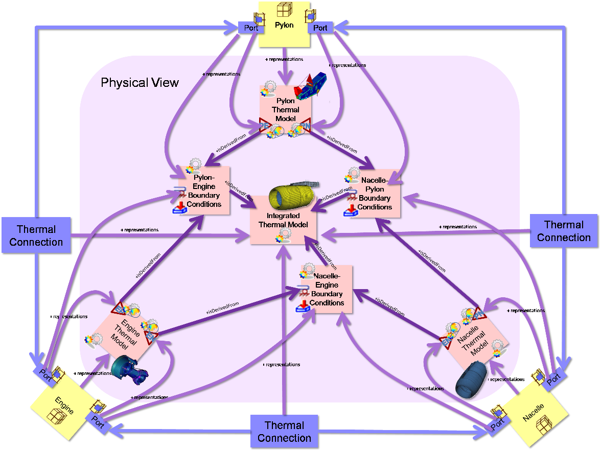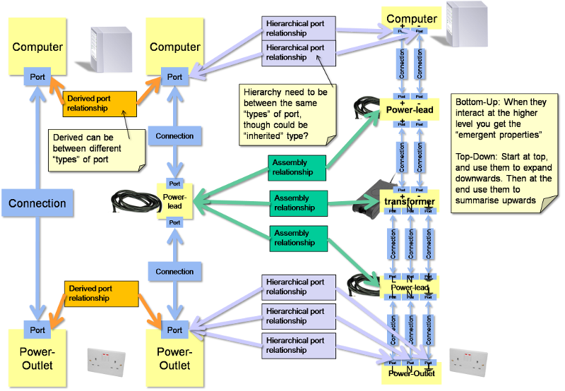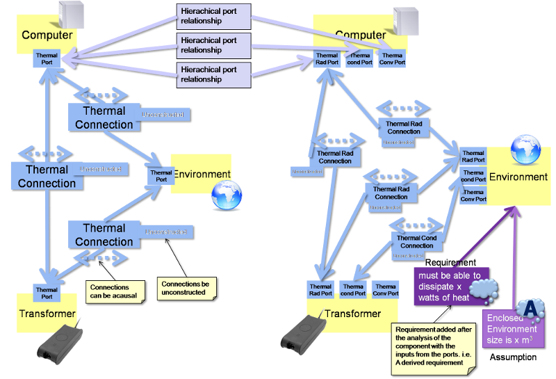 - An example of a Hierarchical relationship could be on port that is for Thermal interface, and this has a hierarchical relationship to a Radiation-Thermal port, a Conduction-Thermal port and a Convection-Thermal port. i.e. the children of the hierarchy can be gathered up to make the parent. Similarly an Power port can be broken down into Mechanical power, Thermal power, etc. Ultimately a “world” port is made up of the Power, Information, Spacial and Matter constituents.