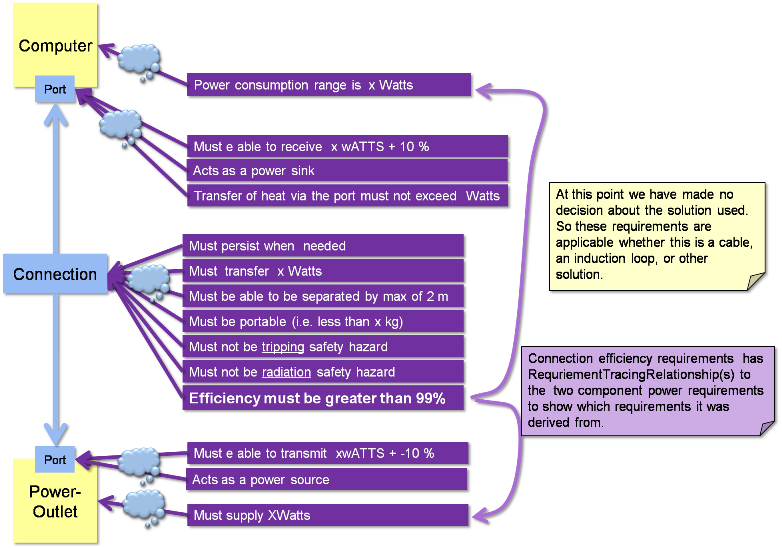 - Derivation relationships are when the one port is derived from the other, for example when more detail is known about how an interface behaves because of design decisions. E.g. when it has been decided to connect the computer to the power-outlet with a cable the post-decision port on the computer is derived from the pre-decision port, in that it needs all the requirements/features that were understood from the pre-decision, but also some additional requirements/features.