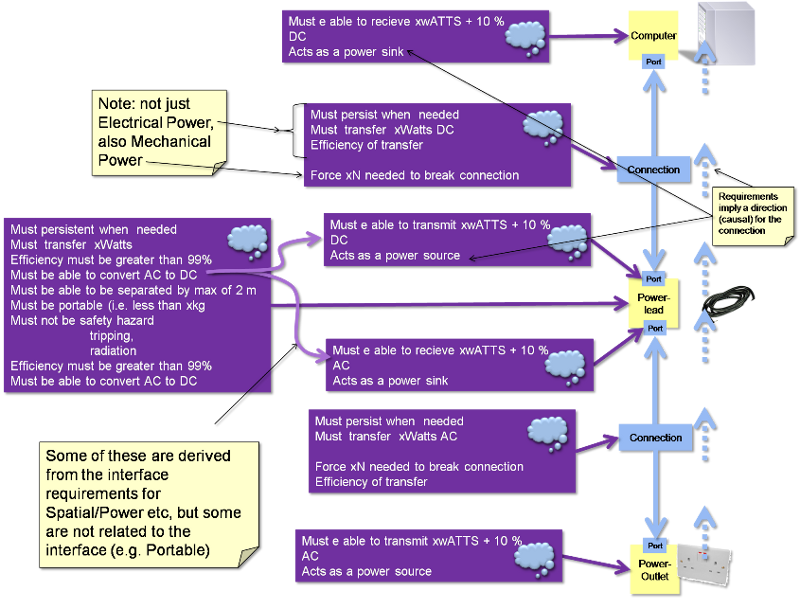 Interface Connections and Ports can have type definitions and properties. They can also have Specifications applied, for example a connection may have a stiffness behaviour specification and a port may have specifications for mating conditions or positioning. On the computer example, the port on the power supply may reference IEC 60906-1 the International standard for 230V AC domestic plug.