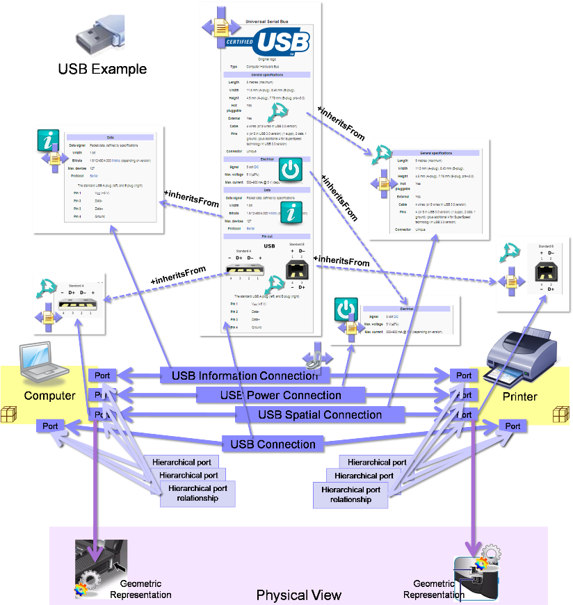 The scenario shows the different areas of the interface that specify the Power, Information and Spatial details are contained in separate InterfaceSpecifications and overall USB specification inherits them. The Computer and Printer Components have three separate sets of ports and connections which are each concerned with only one area of interface. There is then an additional interface that is for the overall USB, and its ports have a hierarchical interface with the ports from the separate areas. The example shows the InterfaceSpecifications are inherited and then used by the overall interface. But it could be that the overall interface understands that it uses the specifications from the child ports in the hierarchy. Also included in the diagram are images of the geometrical representations for the ports on the Computer and Printer.