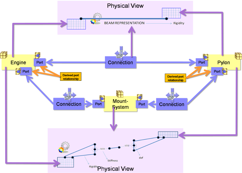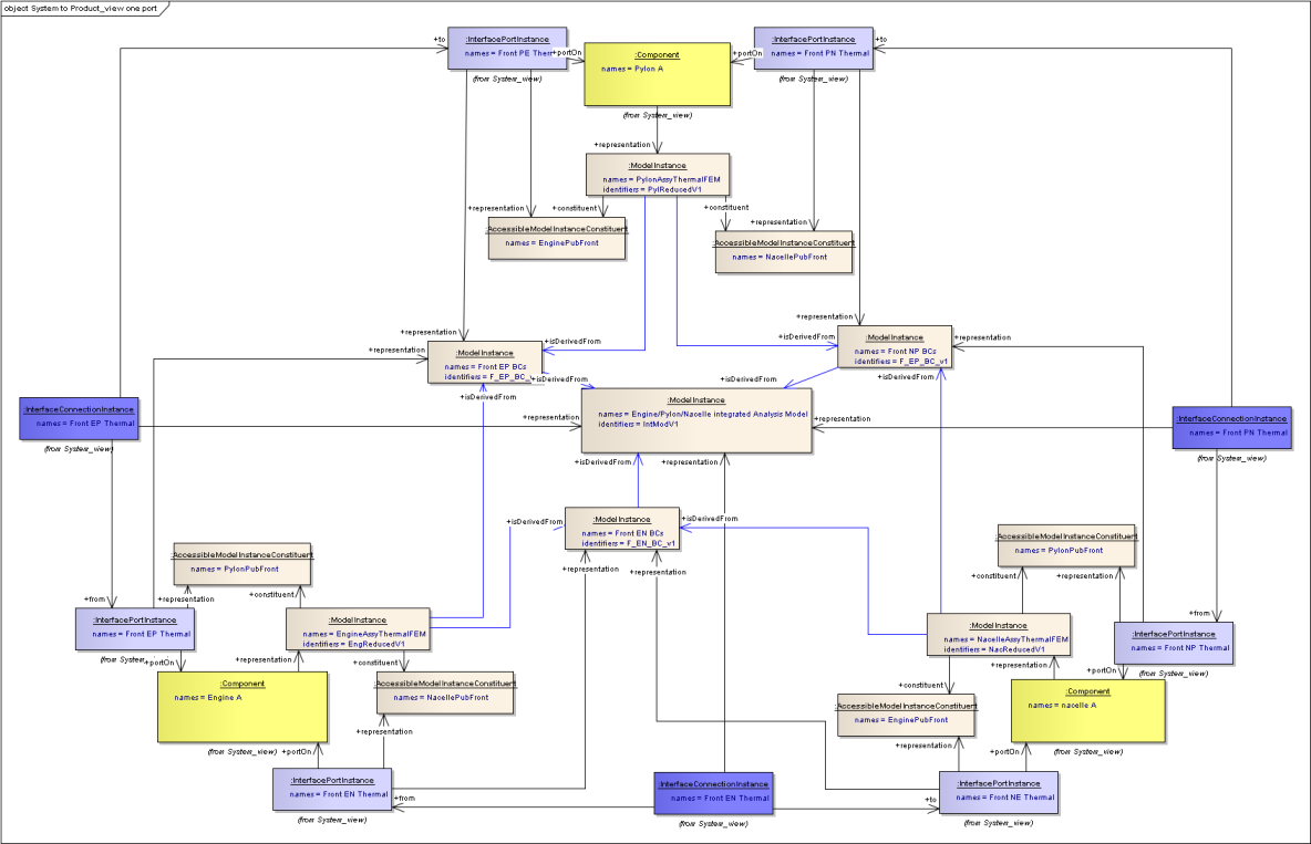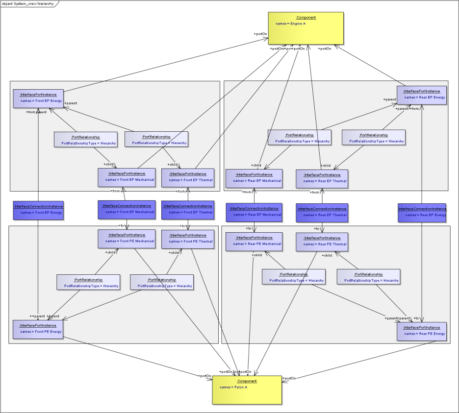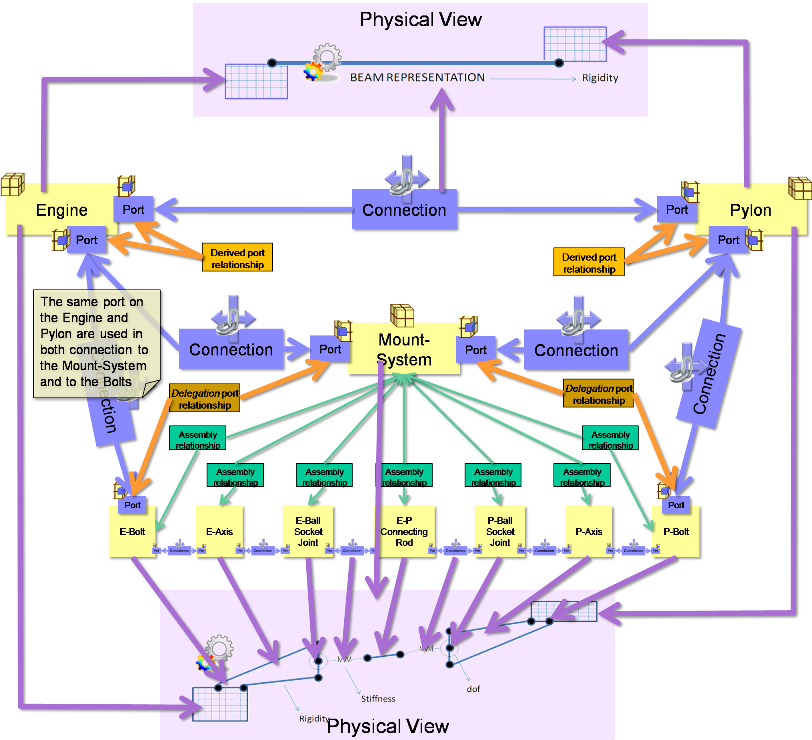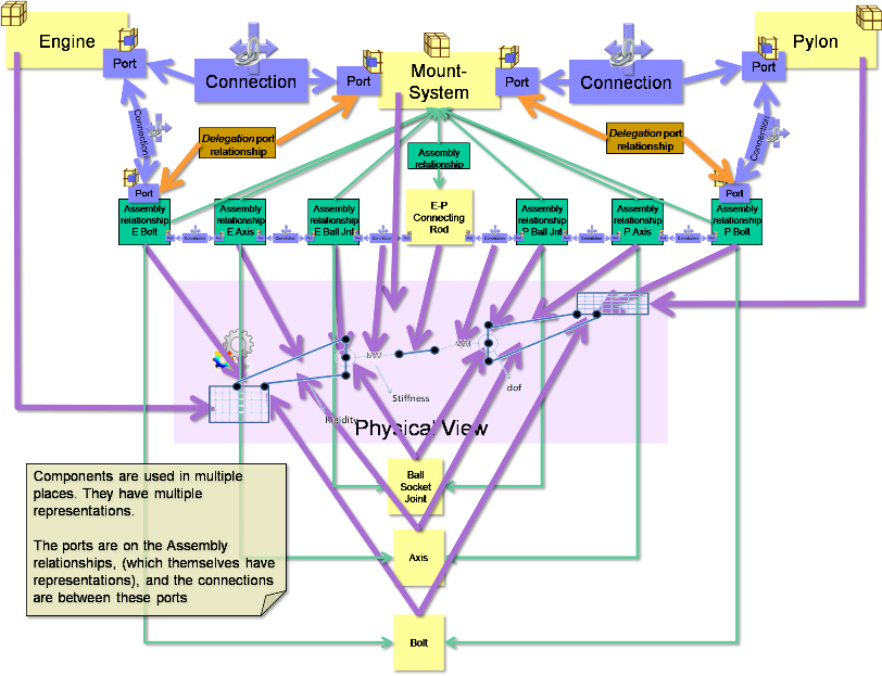 Components can be related to other components using an “ComponentAssemblyUsage”. These are classes rather than simple relationships because they may need names and identifiers, and also links to other classes. In the case where there is a common component that is used in multiple places, the ComponentAssemblyUsage can be used in place of the Component in the System View, so can have Ports, and representations in its own right. An illustration is given below in the Engine - Mount-System - Pylon example. See also SysML - Breakdowns and Components Diagram. PortInstances and PortTypes are linked using a PortRelationship class. This is a class rather than a relationship so that different types of relationship can be defined without having to update the Business Object Model. This is achieved by using a string enumeration that is controlled outside of the Business Object Model.