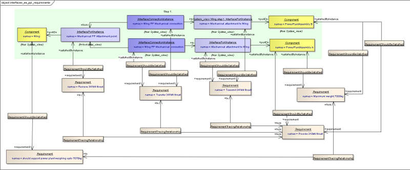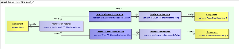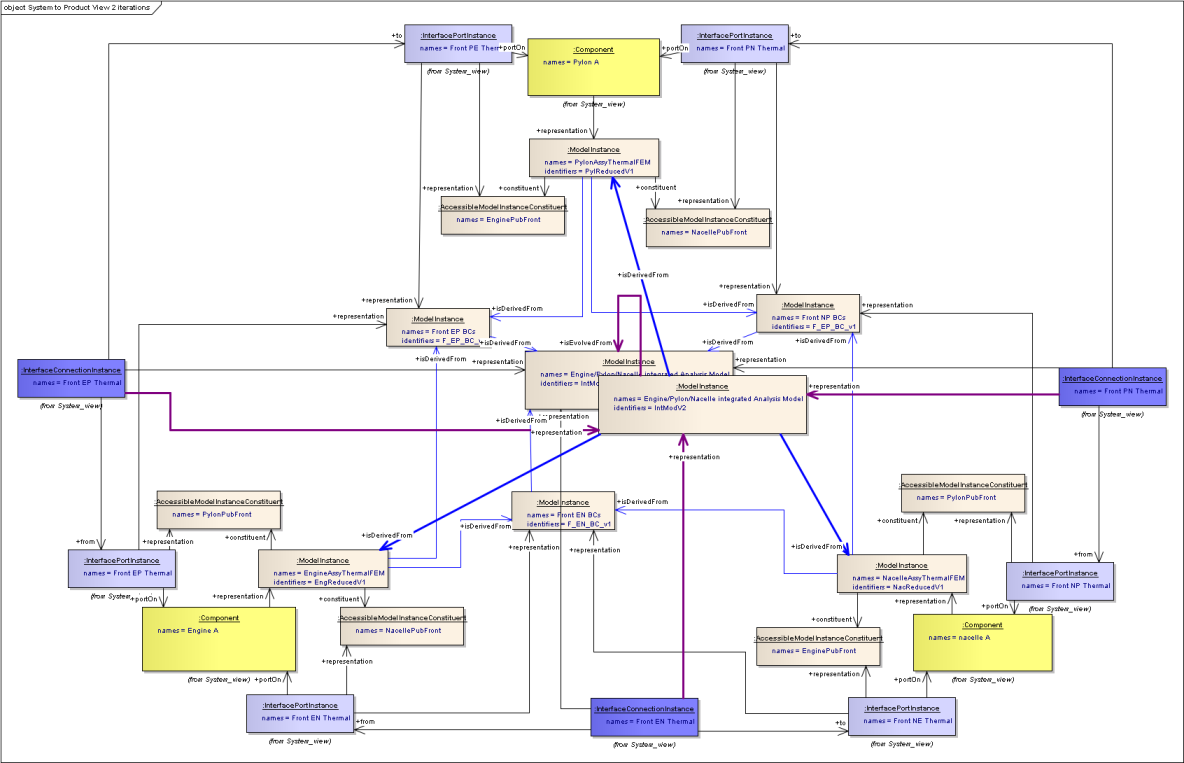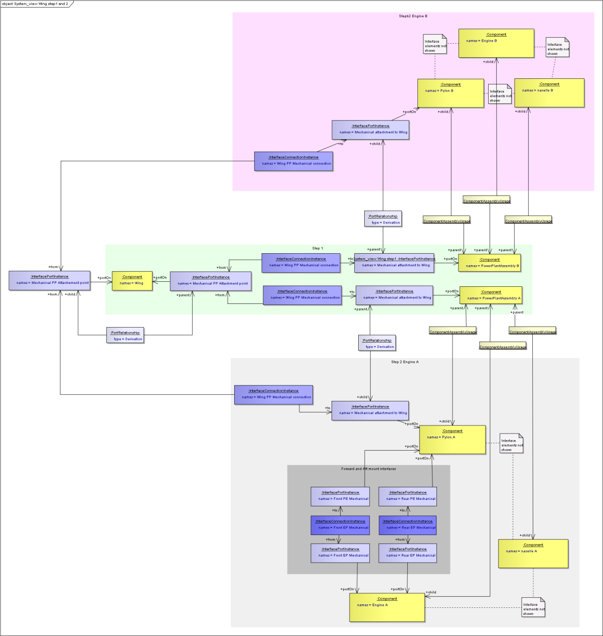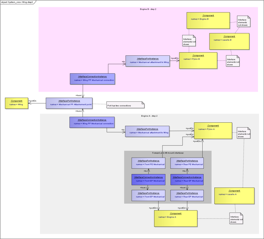 Components can be related to other components using an “ComponentAssemblyUsage”. These are classes rather than simple relationships because they may need names and identifiers, and also links to other classes. In the case where there is a common component that is used in multiple places, the ComponentAssemblyUsage can be used in place of the Component in the System View, so can have Ports, and representations in its own right. An illustration is given below in the Engine - Mount-System - Pylon example. See also SysML - Breakdowns and Components Diagram. PortInstances and PortTypes are linked using a PortRelationship class. This is a class rather than a relationship so that different types of relationship can be defined without having to update the Business Object Model. This is achieved by using a string enumeration that is controlled outside of the Business Object Model.