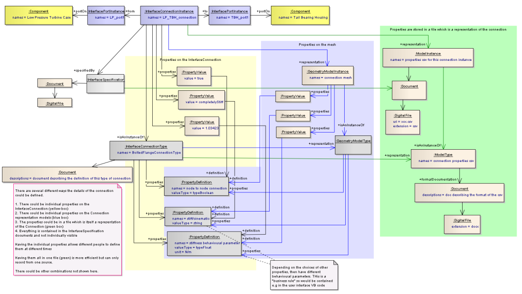 Properties - with the PropertDefinition on the Types (InterfaceConnectionType and InterfacePortType) and the Values on the Instances (InterfaceConnectionInstance and InterfacePortInstance)
