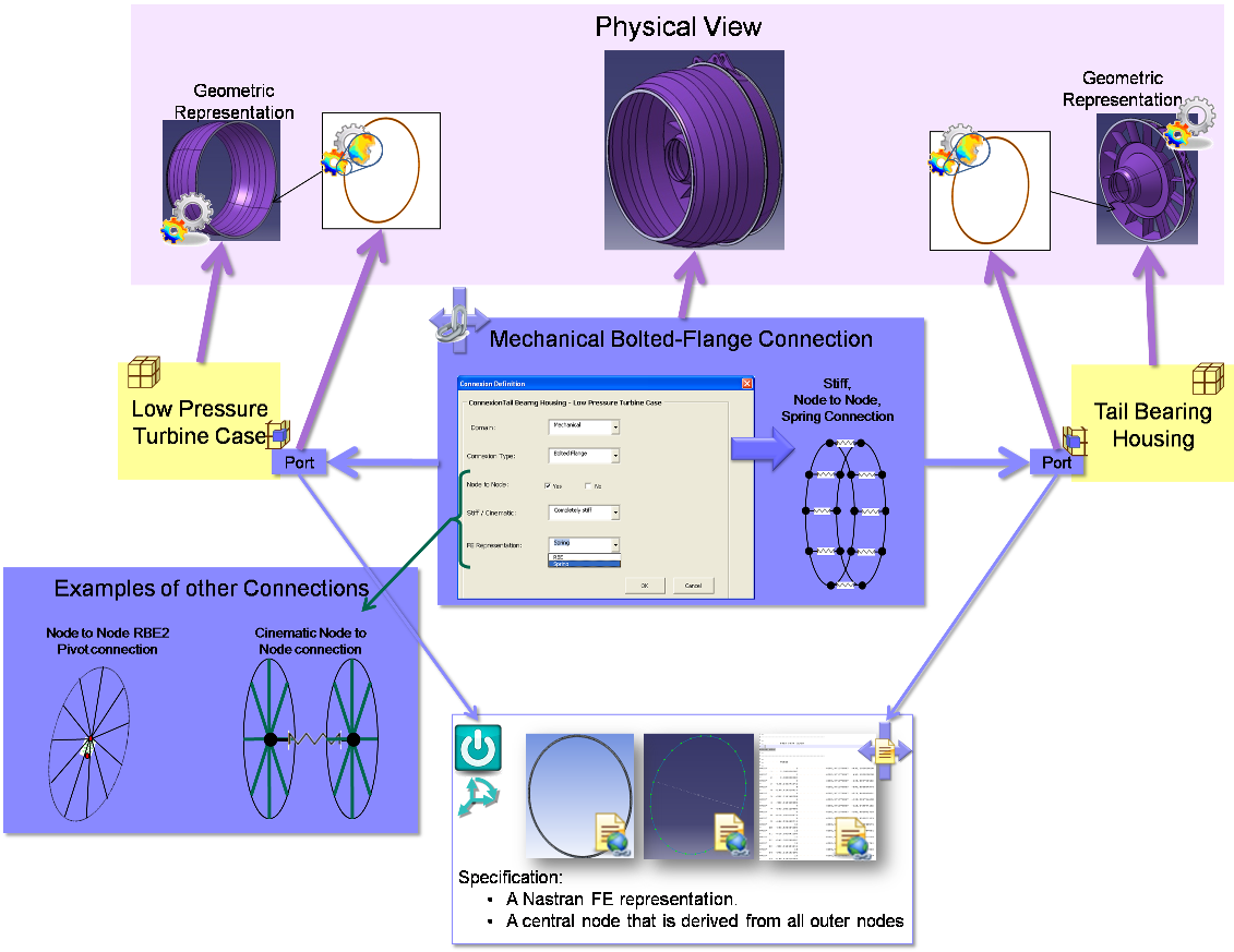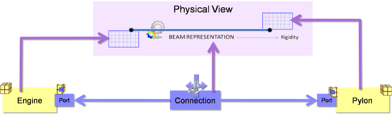 Because all the interfaces are contained in the integrated model, it is a representation of all the Connections. The boundary conditions can be exposed either using AccessibleModelInstanceConstituents, or by creating new models containing just the boundary conditions that are derived from the integrated model. These become the representations for the Ports. Using boundary conditions in separate models has the advantage that separate element analysis steps only need the model of the boundary conditions, not the complete integrated model from which to access the constituents. This is illustrated below:
