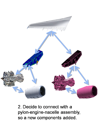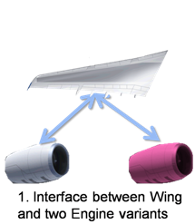 The scenario could be extended earlier in the lifecycle, to when it is undecided whether to have the engines mounted under the wings, or whether to have the engines embedded in the wings. For example with the concept plane shown below: