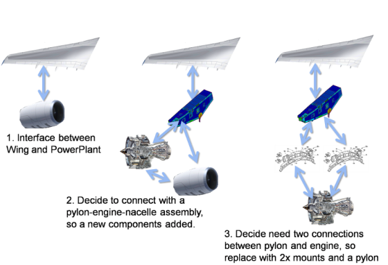 - Step 2. A decision is made to attach the power plant using a pylon with engine and nacelle, but to be able to have different engines. Each engine can have a different pylon attachments, which means that there are unique pylons for each engine, but that each pylon must interface in the same way to the wing.