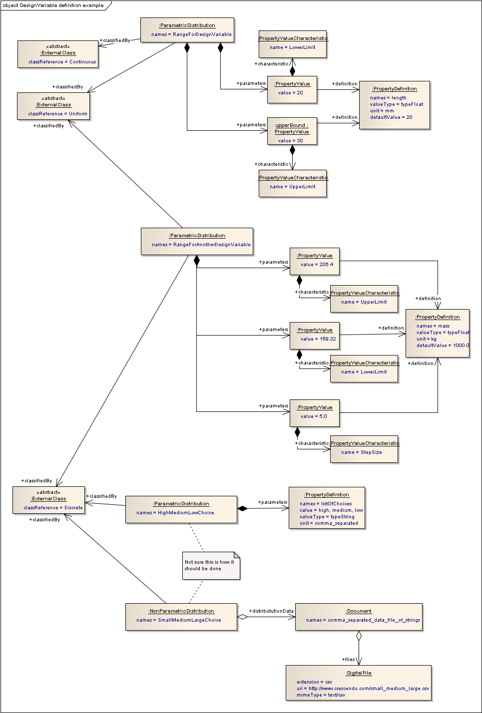 - This might appear to be an “overkill” for a simple range, but it is a way to have agreed sets of parameters for the different types of range, and also clearly state the “type” of the range with a classifiedBy. The resultant distribution for a simple range is to use a distribution (classified as uniform and continuous) that has two properties for the upperBound and lowerBound. This is flexible than just applying the properties to the D2XVariable, and only needs one extra element. Also using a distribution provides a common way to define all variables, so for example a Normal Distribution could be used to define the environment temperature in an External Variable, or a Discrete distribution can specify a file for the values, or properties for the values e.g. High, Medium, Low.