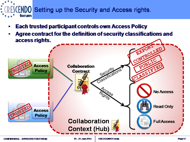 Associated to a Team of trust “Collaboration context” contract, can be a contract to agree the definition of the security classification and access rights that can be applied to objects that will be used for collaboration.
