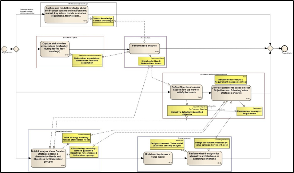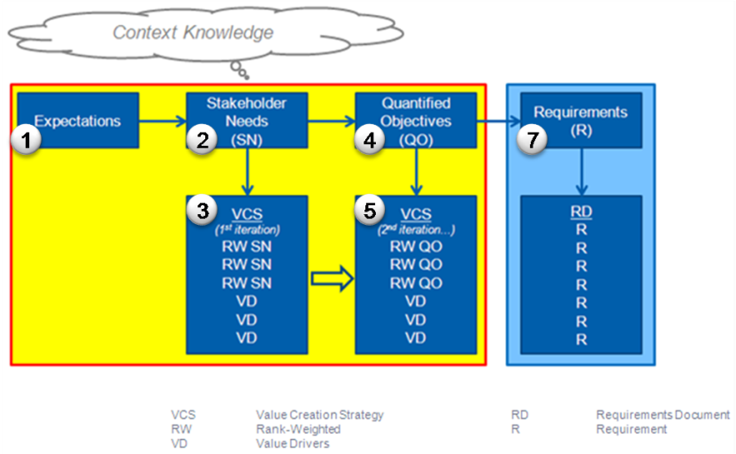 - Based on step (1), plus any additional available context knowledge, stakeholder needs are identified, analysed and rank-weighted.