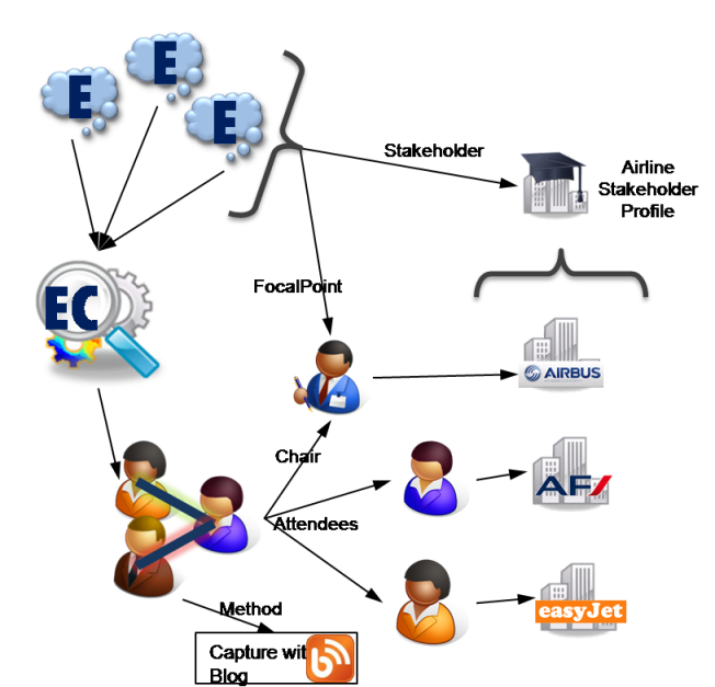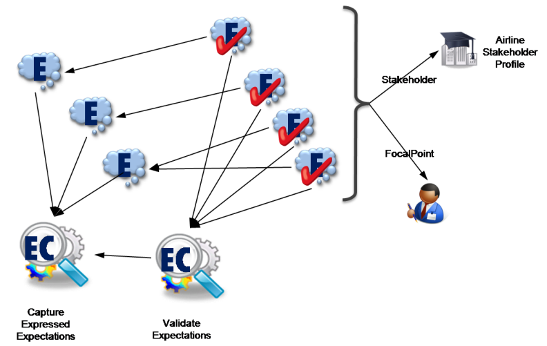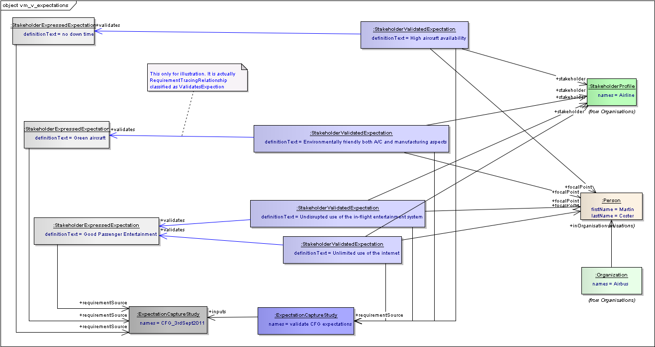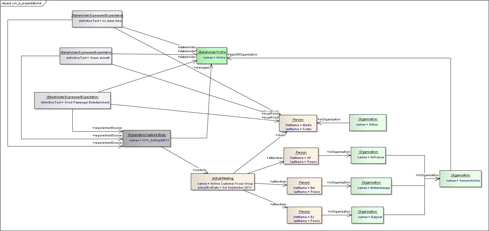 It is decided to capture some expressed expectations from some key airlines at a customer focus group. An expectation capture study is created, and the customer focus group meeting associated to the study. Note, there are many more relationships that could be set up here, including planning the meeting, templates for the meeting, minutes, concerns to be addressed etc. See SysML - Meetings for more details