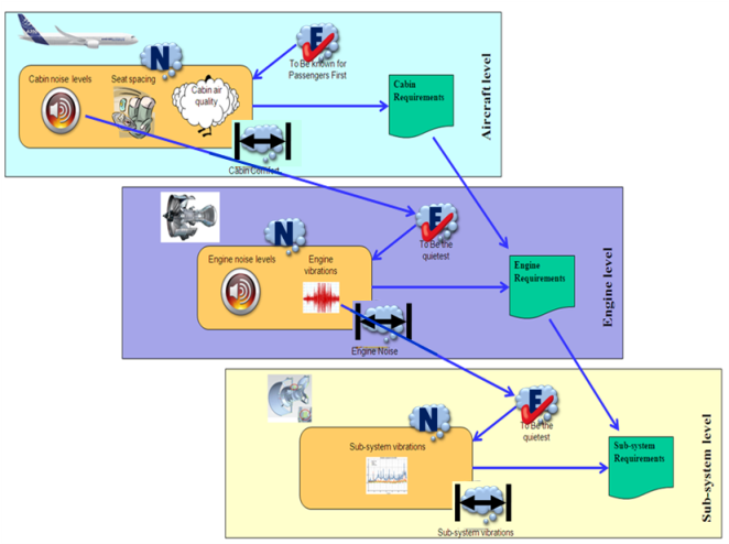 This example only shows the flow downwards for one level, but there is no reason why the flow cannot be across several levels, and also be upwards. For upwards flow the Needs from the Engine Manufacturer become Expectations for the Airframe Manufacturer. The process then becomes cyclical and iterative.