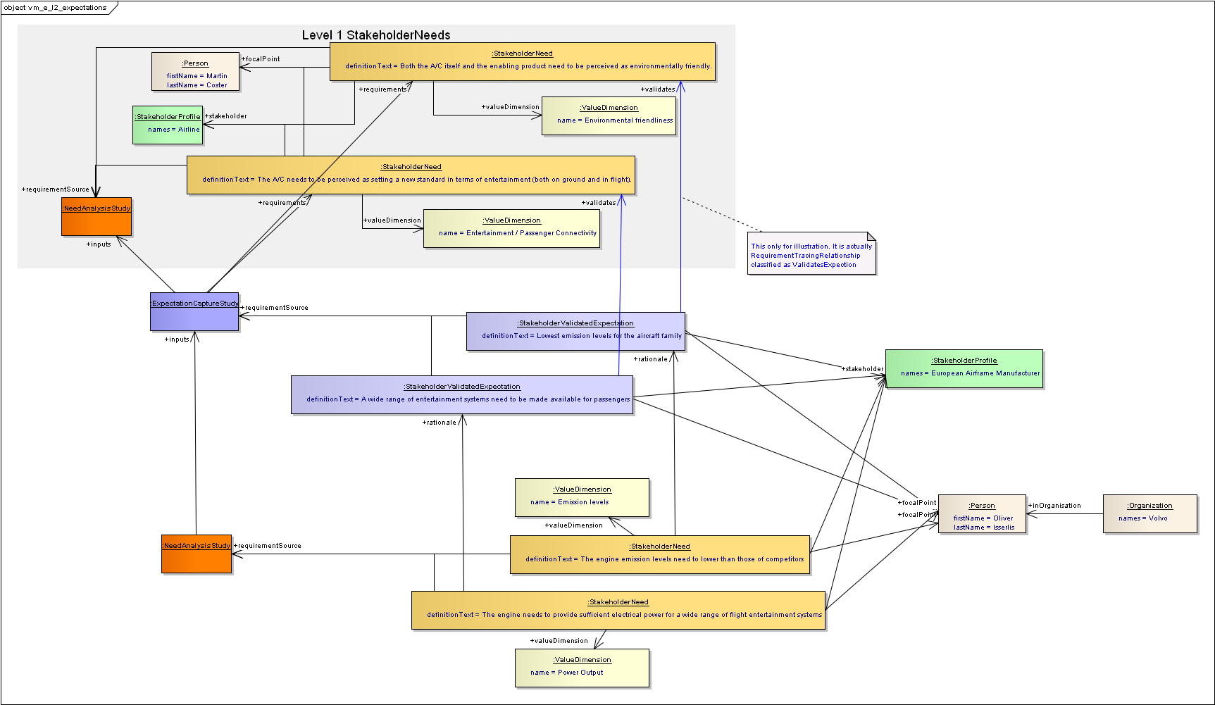 Using the Business Object classes to show how this is done in more detail, the Airframe Manufacturer Needs effectively become the expressed expectations for the Engine Manufacturer, and their own Needs identified. Traceability is maintained between the Expectations and Needs, and between the various Studies used to identify them.