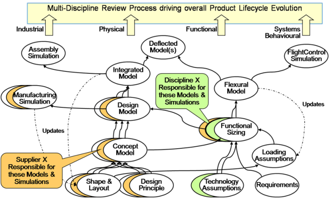 The model network is in effect an explicit single representation of both the design process and the resultant product information. The network is elaborated as design topics are addressed, and network templates are prepared in readiness for key activities. The network records the types of models used, their interdependencies, tools, skills and the resources required to create the models and update them as the design evolves. Today, individual teams within an enterprise exploit the models-based network approach to cascade changes rapidly into the models and simulations they are accountable for. However, the traditional organisation and information systems deployed at enterprise level typically separate the two key aspects of design process and product information management, so it is not possible to realize the full benefits of the models based approach at the team of teams level. In particular: