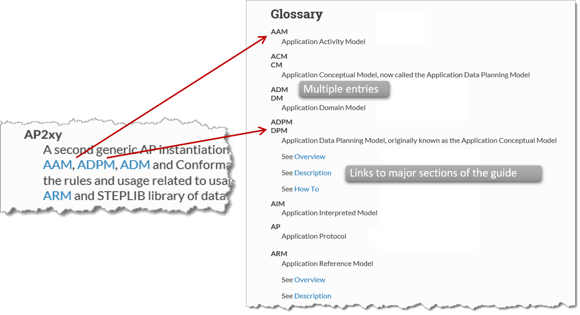 Each term has an entry with the term, definition and links to major sections of the guide: