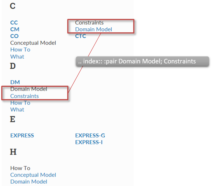 - E.g. for subheadings such as .. index:: :pair Domain Model; Constraints