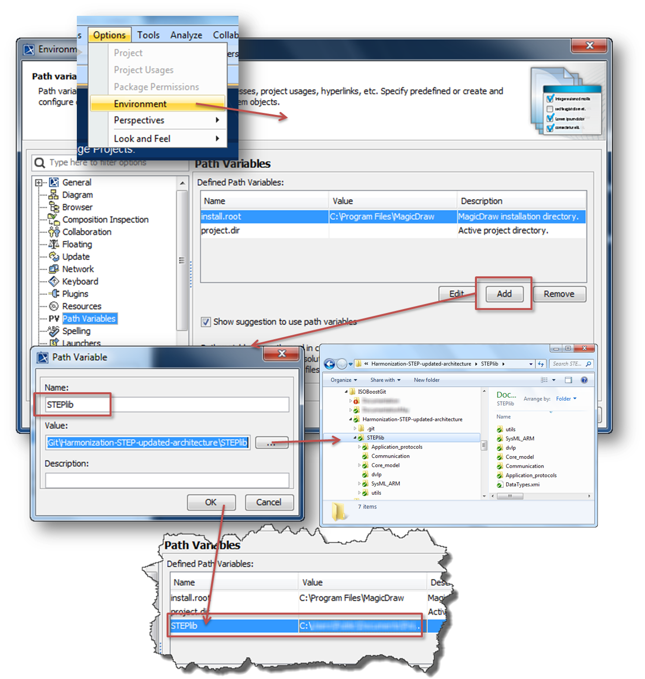 A path variable (Options->Environment->Path Variables) STEPlib needs to be added and set to the path to the STEPlib folder in the cloned Git project.