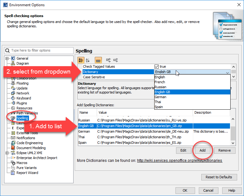- Check that English GB is in the list of options (lower panel). If it is not, a copy should be in the same installation folder as the other dictionries and can simply be added. If not, then a copy should be obtained from the internet