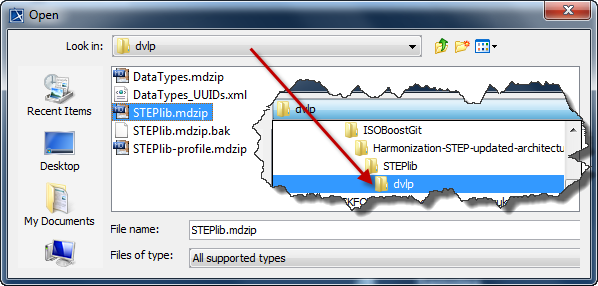 The top level model is STEPlib.mdzip and is stored in the STEPlib/dvlp folder.