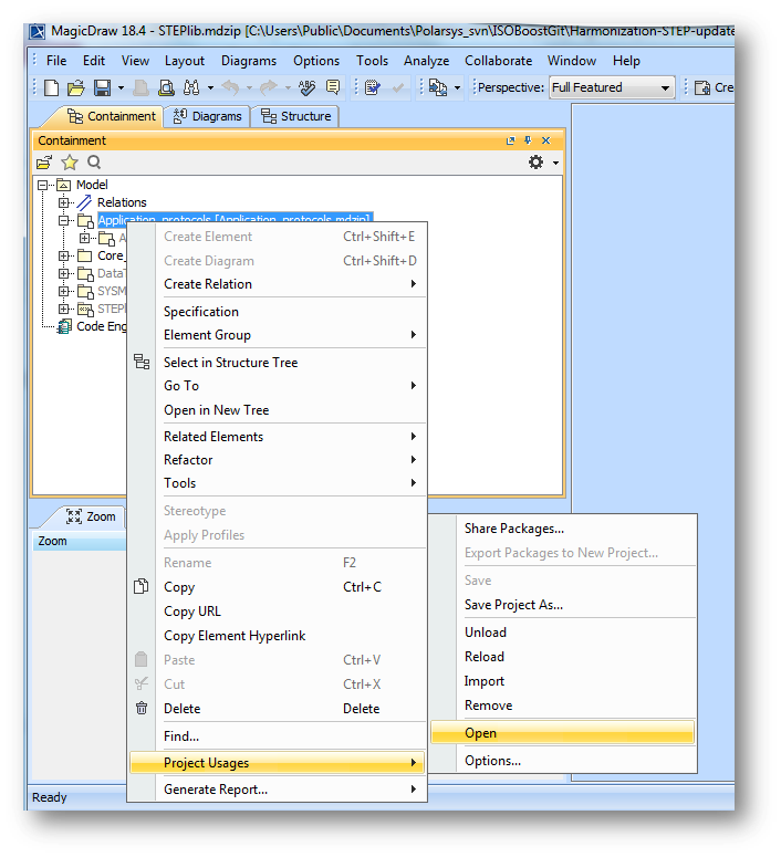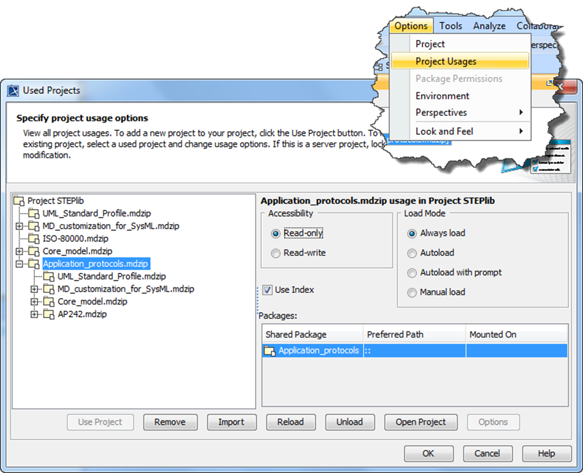A sub-project is opened using the “Project Usages” dialog which is available from the tree on the M-R menu for single projects (see Figure 20). Alternatively the settings for multiple projects can be controlled from the “Options > Project Usages” (see Figure 21). These are illustrated below. For more details see MagicDraw online help - Managing used Projects.