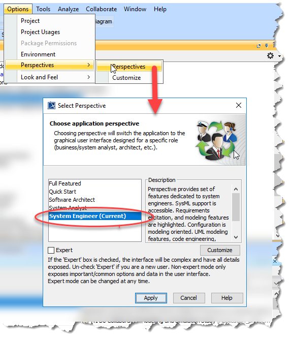 The SysML tools are accessed when using the “System Engineer” perspective which is not the default so needs to be set using Options > Perspectives > Perspectives.