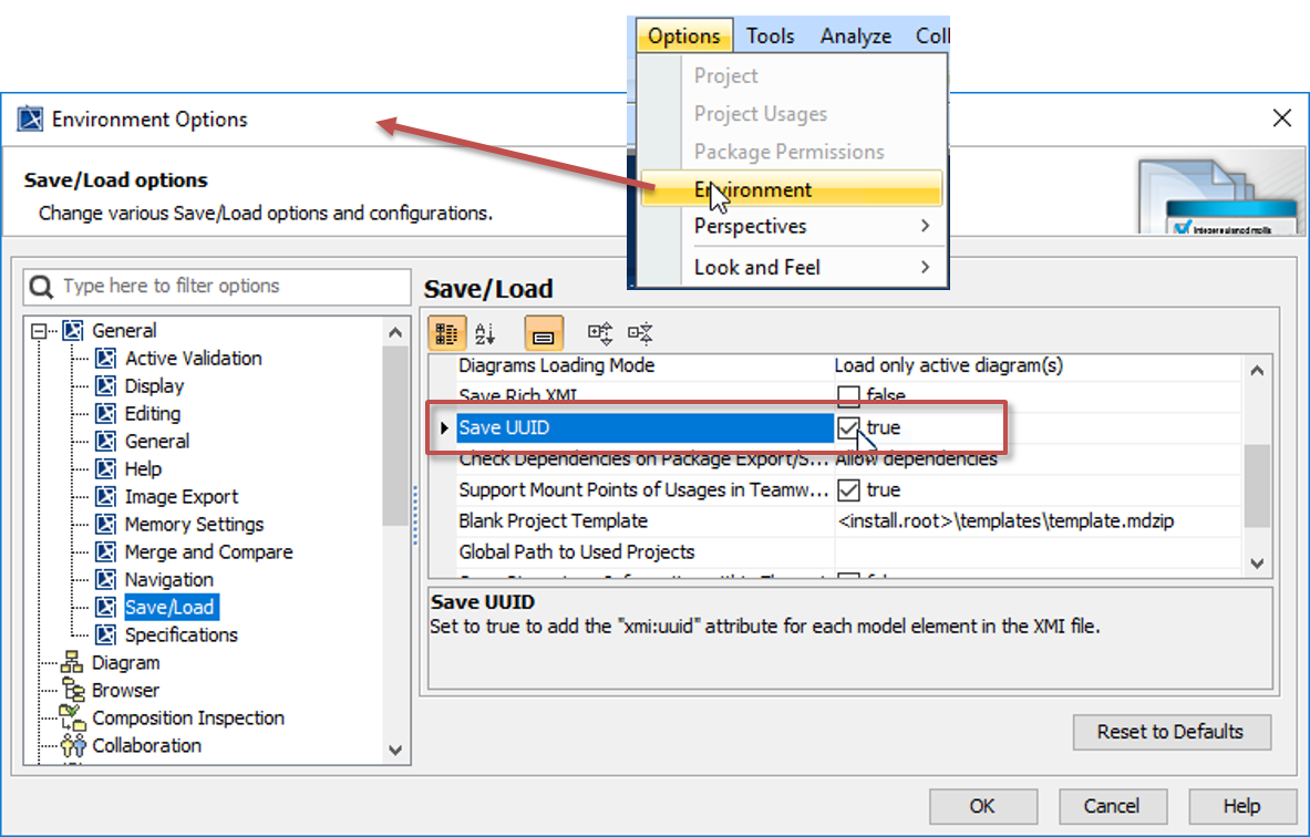 - In the main menu of your modeling tool, go to Options > Environment. The Environment Options dialog opens.