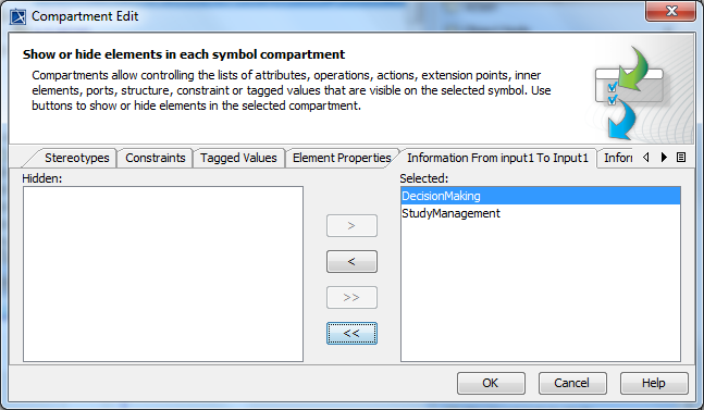 Mouse-R on object flow and select “Show Compartements”, select table “Information from X to Y” and then >> to move all to right. Now the CM objects are displayed