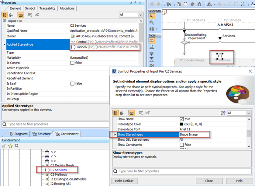 Tunnels on Input and Output pins are identified by adding the TunnelH stereotype.