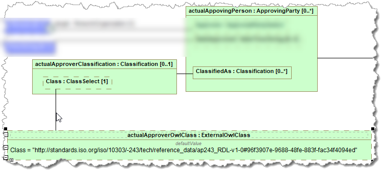 The mapping uses Reference Data Classes from the Reference data that is set as the default value of an instance specification . The selected OWL class should be a sub class of the block to which the classification is mapped. In the following example, the classification is mapped to the Core model block ApprovingParty, and therefore the selected OWL class is a sub class of “approving party”.