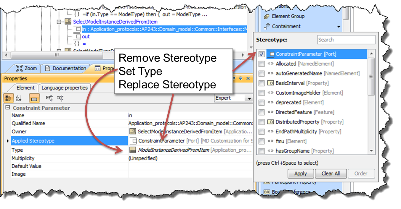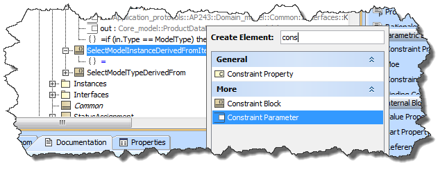 This example is creating a constraint block for a “select type”, so it needs two constraint parameters, the input of the Domain Model “select type” and an output typed to the appropriate object from Core Model. The contraint is then a if-then-else conditional.