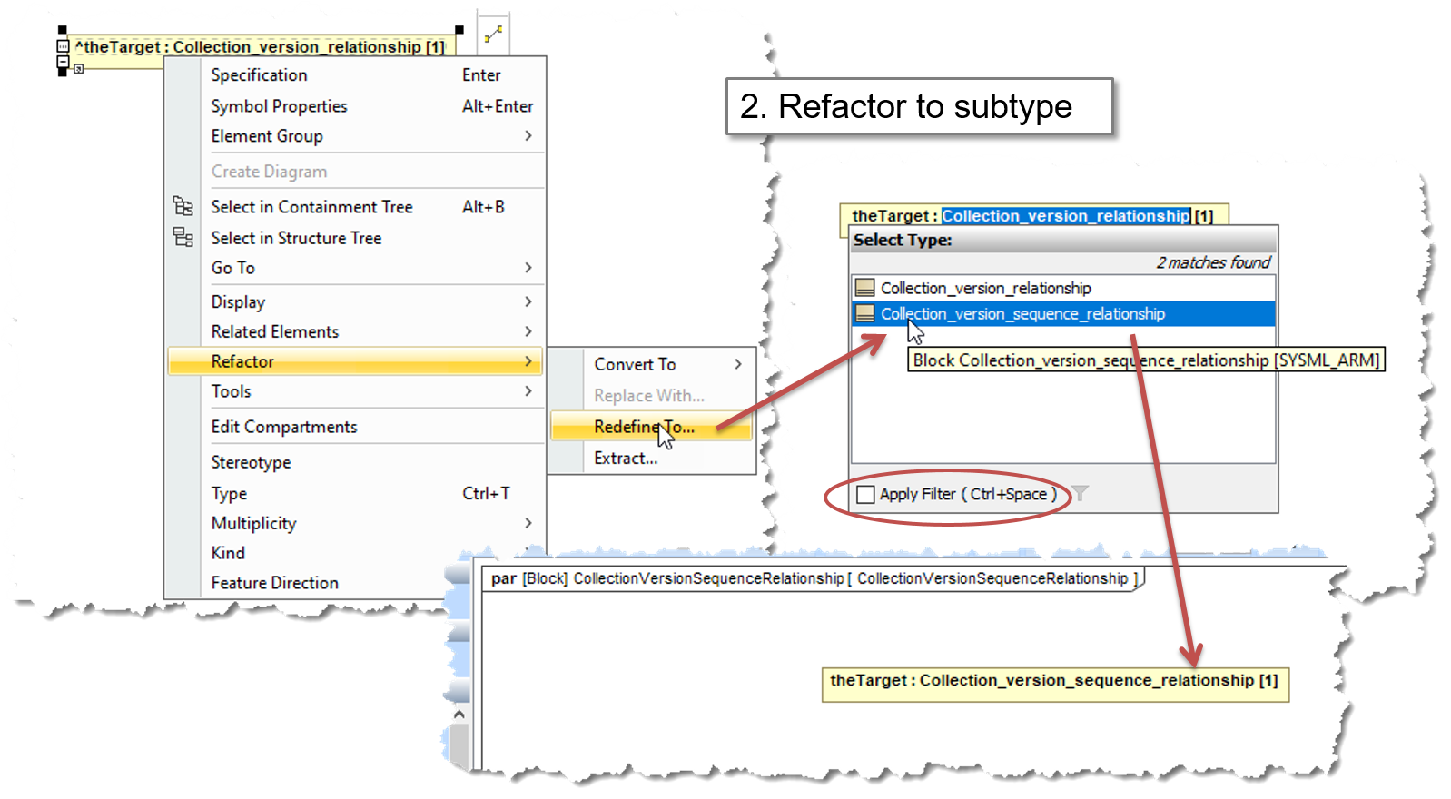 Should just be able to use the inherited. Assumes the redefined are sub-types of the objects they are redefining. See also Redefined Properties