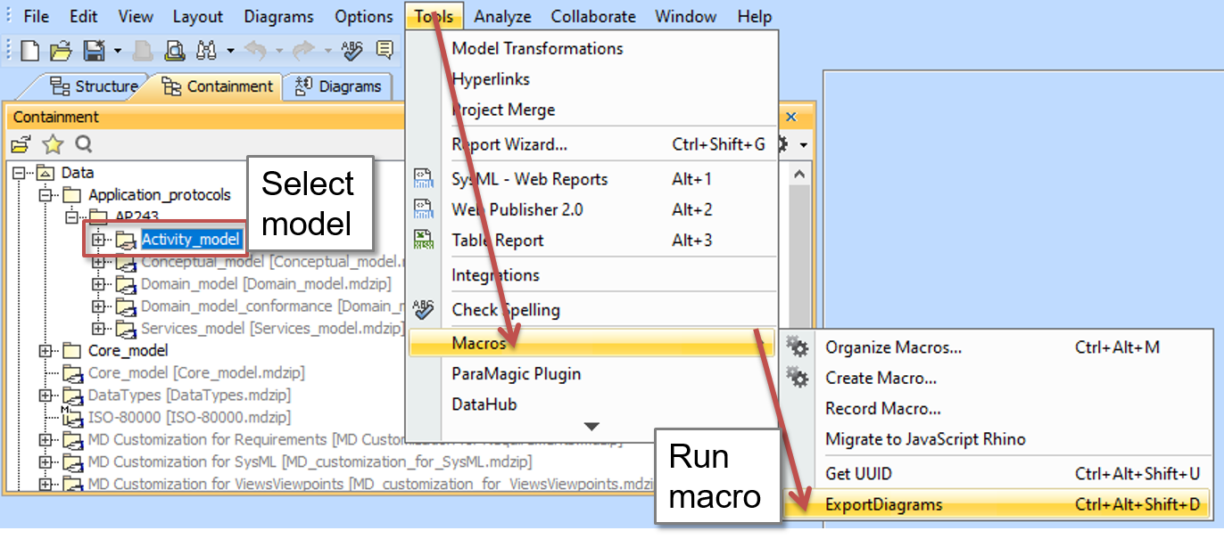 In MagicDraw use the STEPlibutilsMagicDrawexportDiagramsMacro.js to generate the diagram images. see Load Macros for how to load and use macros.
