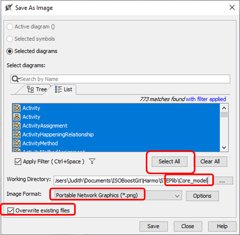 Select all the diagrams and save as png to the model folder without dvlp, overwriting existing files: