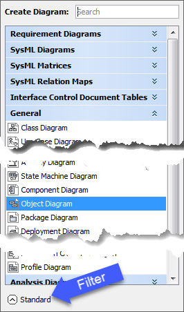 Having created suitable packages, add an Object Diagram to the packages. The Object Diagram is available from General list for the Expert filter.