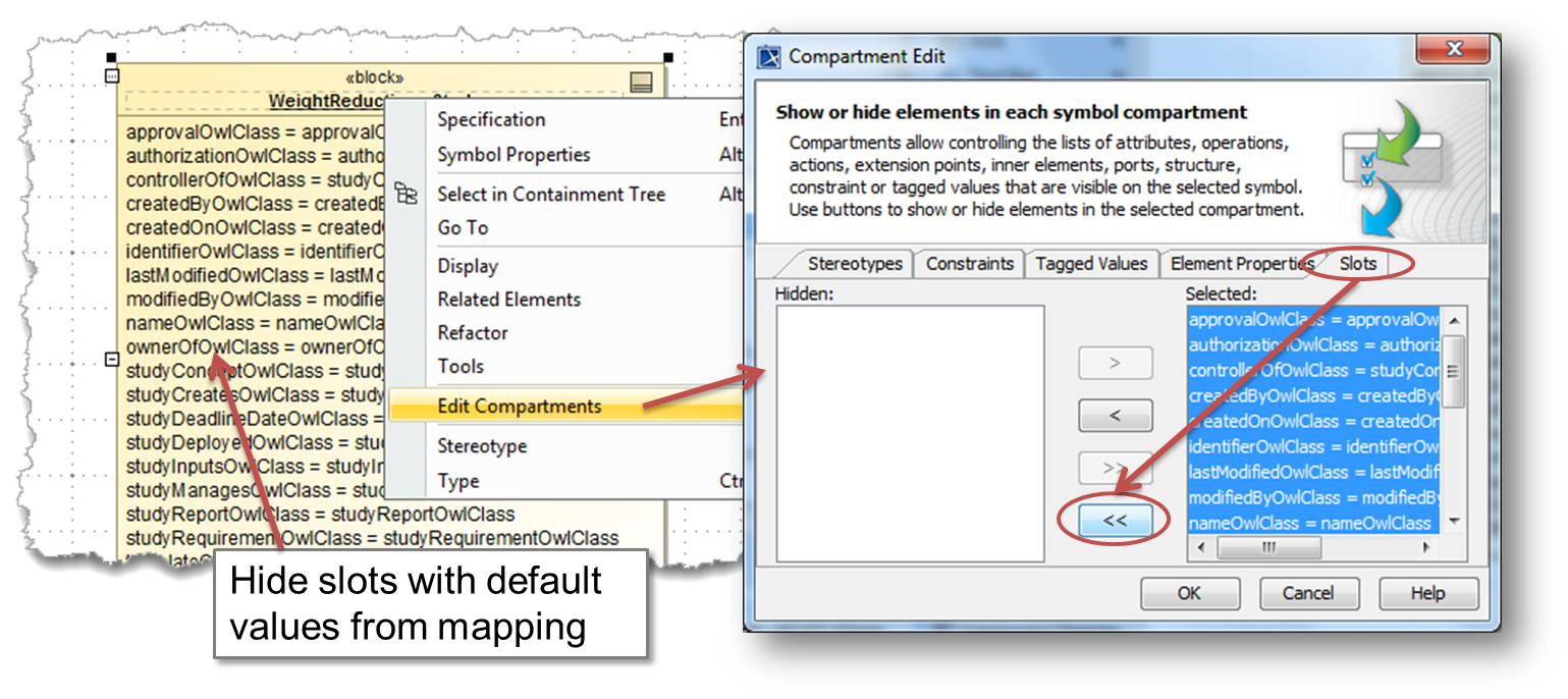 The default display is to show all the public slots with values. This will include elements from the mapping that were provided with default values, typically for classifications. These should be hidden using the Edit Compartments