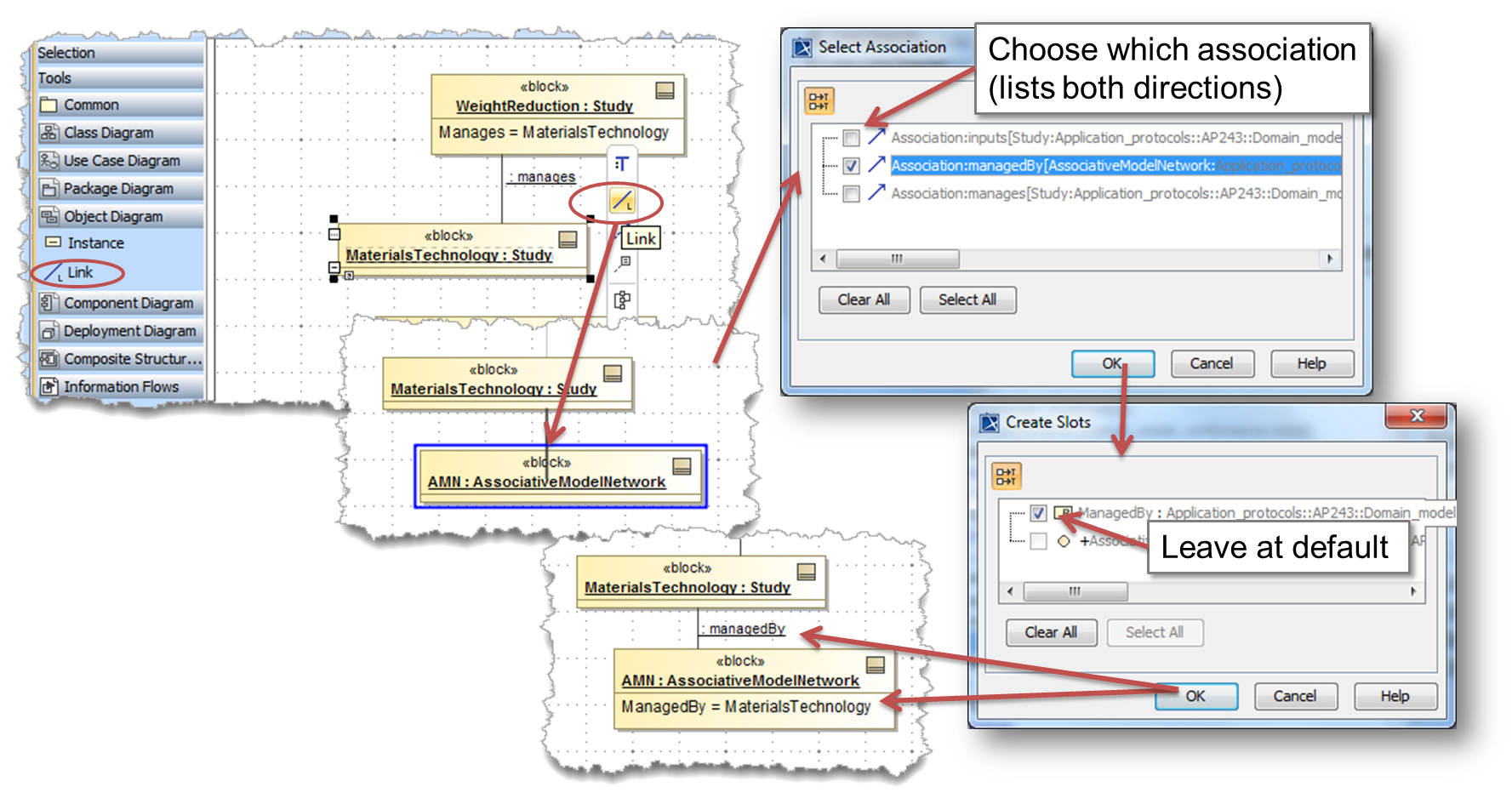 - Only valid links should be created, therefore it the Select Association dialog does not appear the link should be deleted