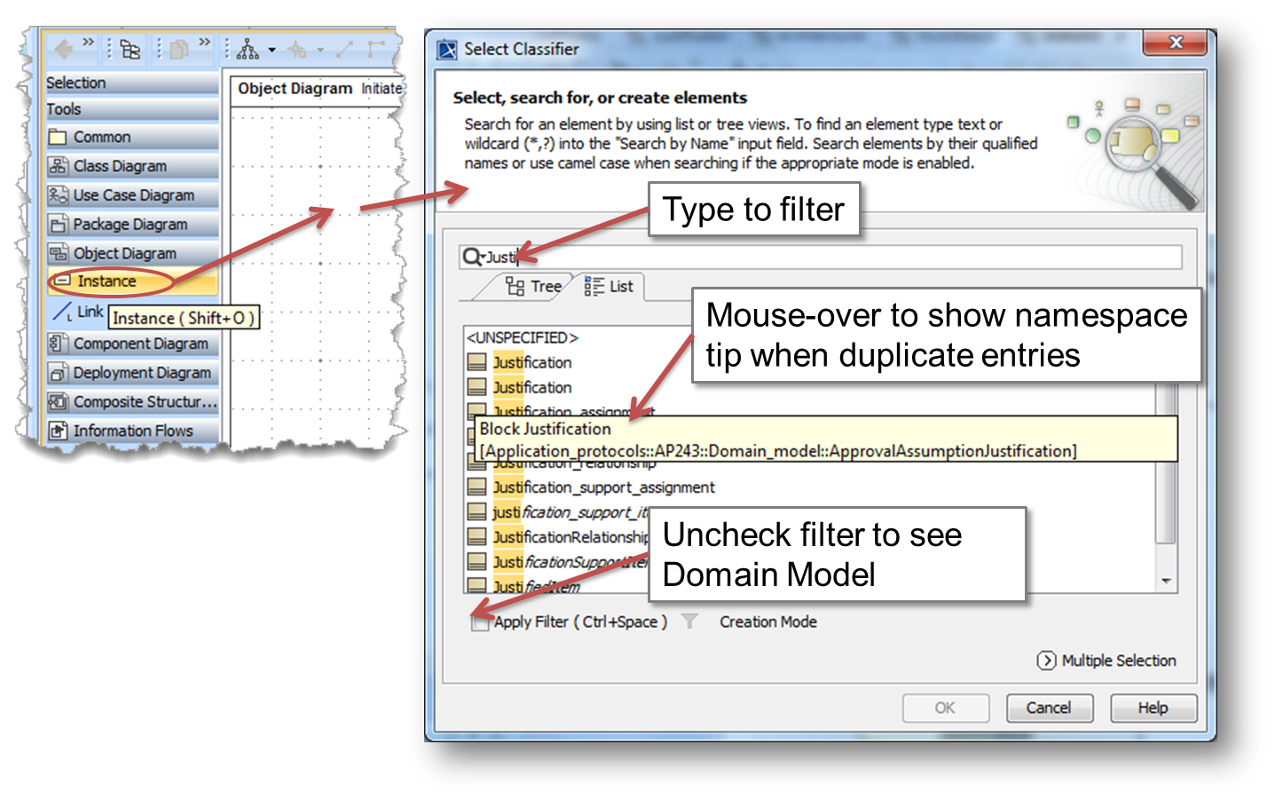 New Instance Specifications are created by dragging the Instance from the menu onto the diagram. This will open a Select Classifier dialog as shown below. Turn the filter off to be able to see the Domain Model entities. This will also show all other entities including the Core Model, so hover the mouse over the block icon to show the namespace tool tip to tell which is which. The type-in box at the top can be used to filter the list.