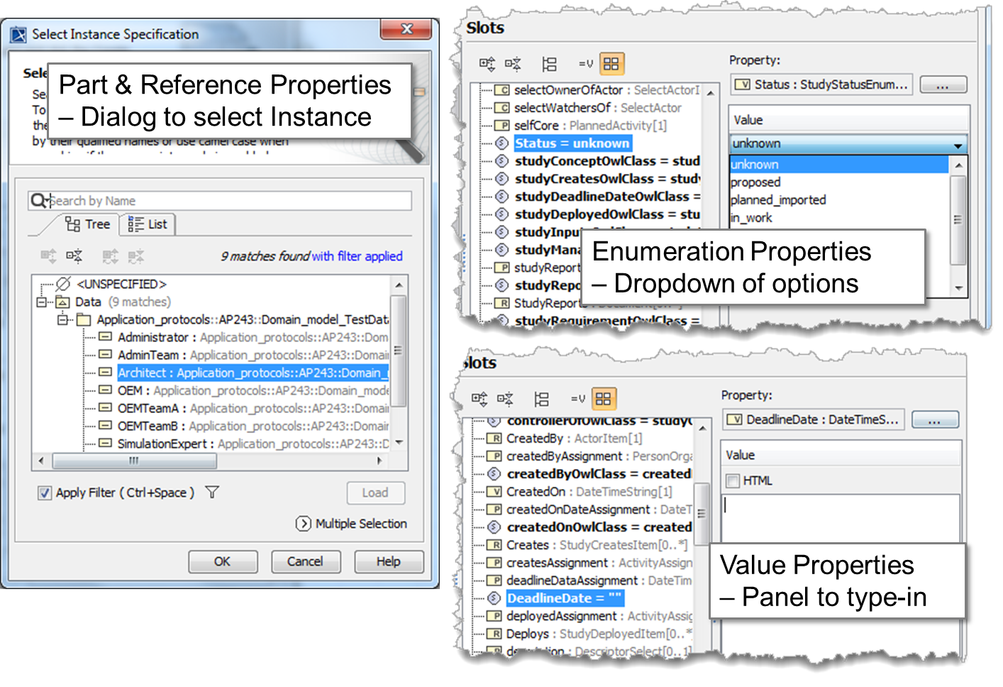 - Part and Reference Properties - a Select Instance Specification dialog is presented to select the other entity